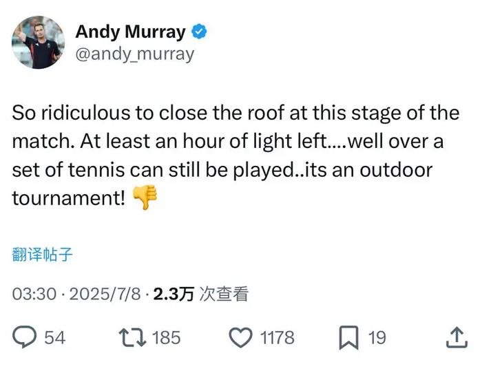“比赛这个时候关顶棚太荒唐了,离需要补光还有一个多小时呢,完全还可以再打一盘,这是一项室外赛事。”从英国名将穆雷针对这件事公然替迪米特洛夫发声,炮轰温网组委会的这番言论来看,就知道为何很多人坚信这是他们故意针对保加利亚帅哥了。